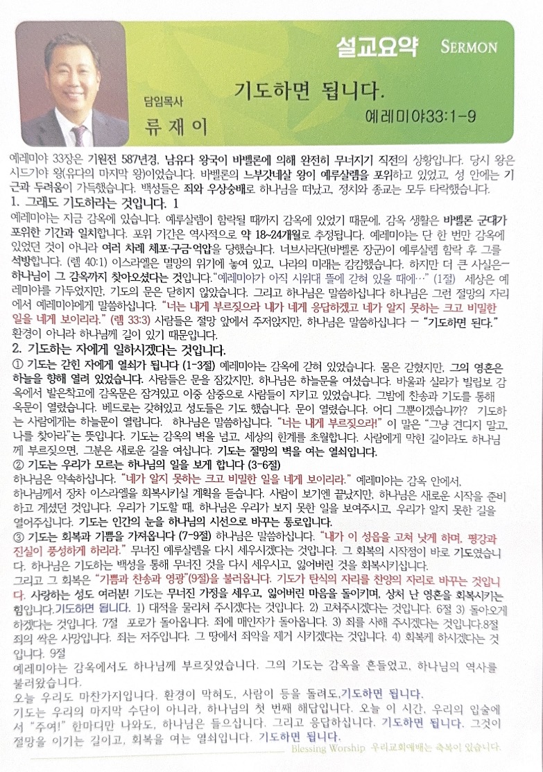 [성경본문] 예레미야33:1-9절 개역개정1. 예레미야가 아직 시위대 뜰에 갇혀 있을 때에 여호와의 말씀이 그에게 두 번째로 임하니라 이르시되 2. 일을 행하시는 여호와, 그것을 만들며 성취하시는 여호와, 그의 이름을 여호와라 하는 이가 이와 같이 이르시도다 3. 너는 내게 부르짖으라 내가 네게 응답하겠고 네가 알지 못하는 크고 은밀한 일을 네게 보이리라 4. 이스라엘의 하나님 여호와께서 말씀하시니라 무리가 이 성읍의 가옥과 유다 왕궁을 헐어서 갈대아인의 참호와 칼을 대항하여 5. 싸우려 하였으나 내가 나의 노여움과 분함으로 그들을 죽이고 그들의 시체로 이 성을 채우게 하였나니 이는 그들의 모든 악행으로 말미암아 나의 얼굴을 가리어 이 성을 돌아보지 아니하였음이라 6. 그러나 보라 내가 이 성읍을 치료하며 고쳐 낫게 하고 평안과 진실이 풍성함을 그들에게 나타낼 것이며 7. 내가 유다의 포로와 이스라엘의 포로를 돌아오게 하여 그들을 처음과 같이 세울 것이며 8. 내가 그들을 내게 범한 그 모든 죄악에서 정하게 하며 그들이 내게 범하며 행한 모든 죄악을 사할 것이라 9. 이 성읍이 세계 열방 앞에서 나의 기쁜 이름이 될 것이며 찬송과 영광이 될 것이요 그들은 내가 이 백성에게 베푼 모든 복을 들을 것이요 내가 이 성읍에 베푼 모든 복과 모든 평안으로 말미암아 두려워하며 떨리라